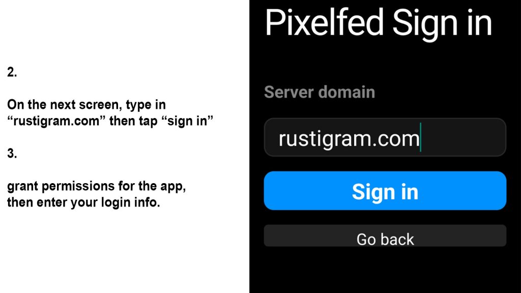 Once you have registered, to sign in with the Pixelfed app, you will need to type in Rustigram.com as the server name in the app as we arent listed in the directory yet. Like this: